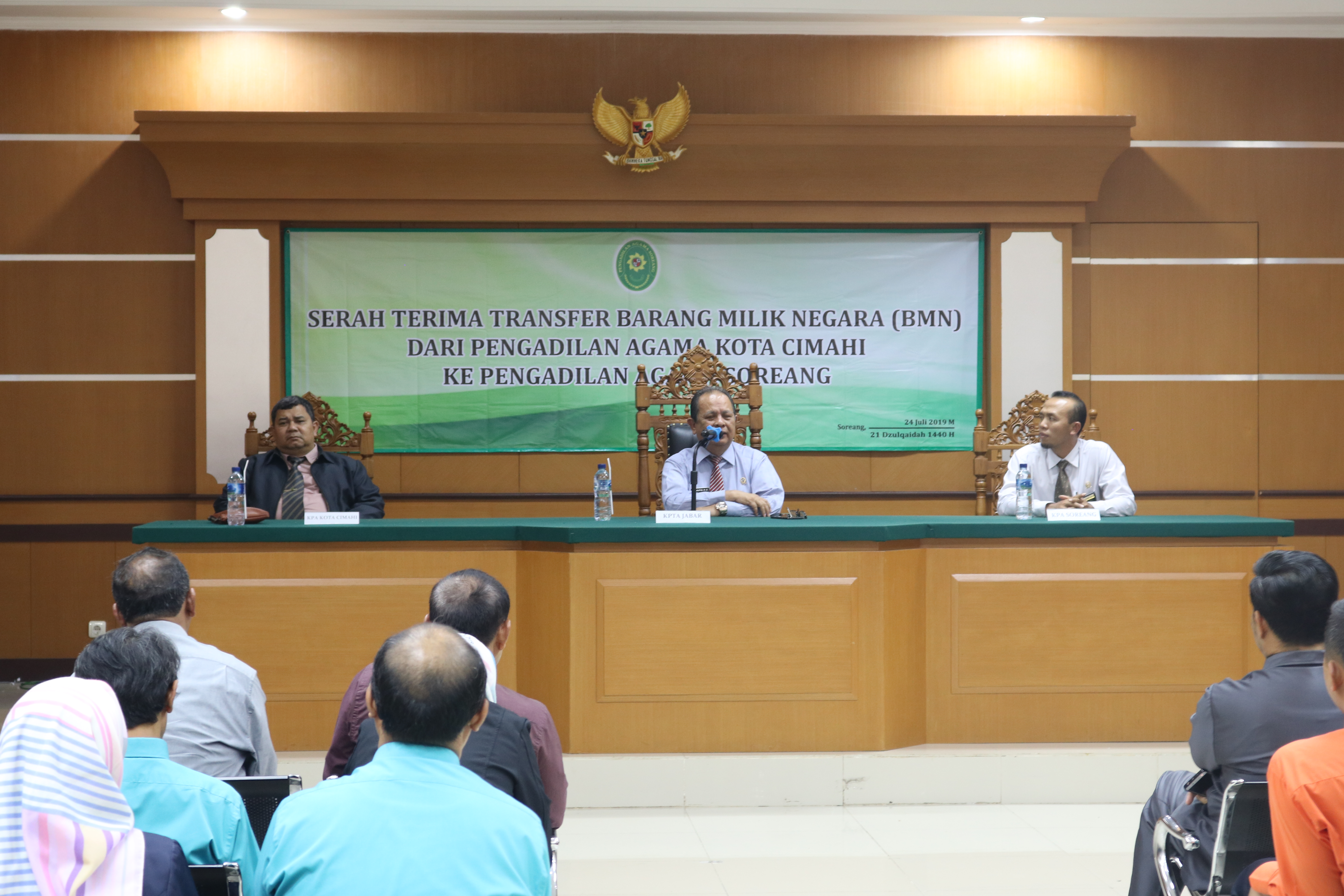 Dalam sambutan dan sekaligus pembinaan, Ketua Pengadilan Tinggi Agama Jawa Barat, Drs. Taufiq H.Z. M.H.I berpesan kepada Ketua dan Sekretaris Pengadilan Agama Soreang agar barang milik Negara yang telah diterima dipergunakan sebaik-baiknya untuk kelancaran pelaksanaan tupoksi dan segera dicatat sebagai BMN Pengadilan Agama Soreang. Dengan berseloroh ia juga menghibur Ketua Pengadilan Agama Kota Cimahi agar tidak bersedih dengan penyerahan aset ini karena dalam waktu dekat insyaallah Pengadilan Agama Kota Cimahi akan mendapatkan anggaran untuk penggantinya.
