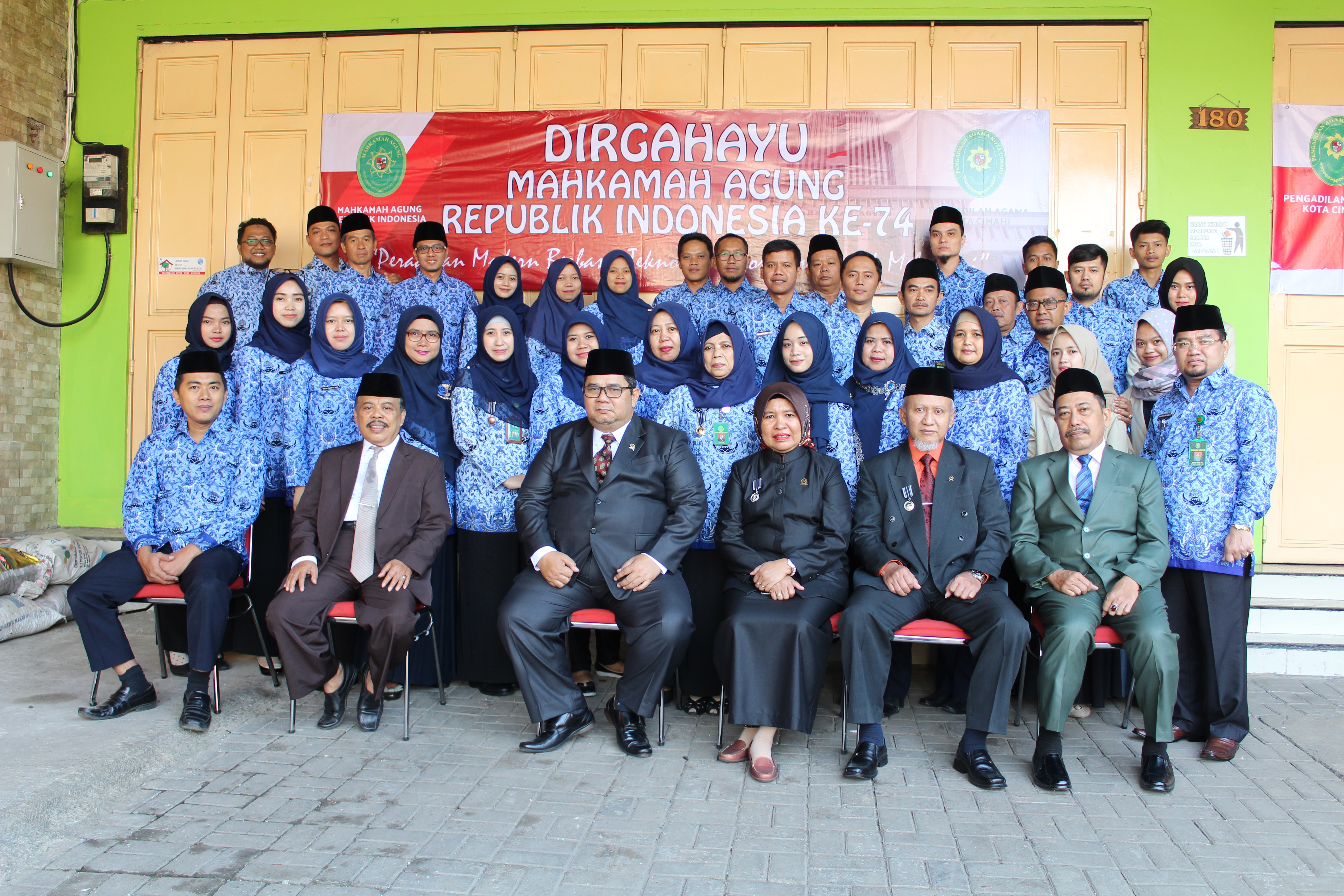 Pengadilan Agama Kota Cimahi melaksanakan Upacara HUT ke-74 Mahkamah Agung RI di halaman parkir Pengadilan Agama Kota Cimahi. Upacara ini dihadiri oleh para Pejabat baik Struktural dan Fungsional, Hakim, Cakim, Pegawai, Tenaga honorer dan mahasiswa yang sedang melakukan PKL di Pengadilan Agama Kota Cimahi.