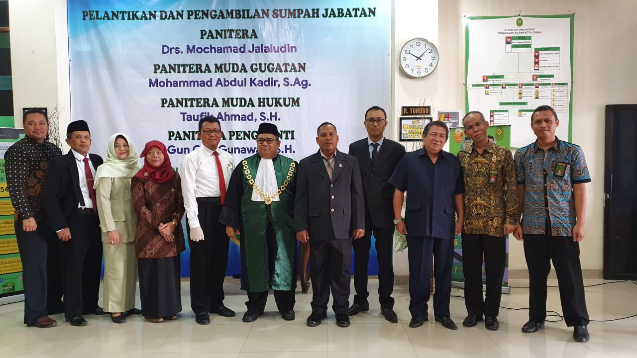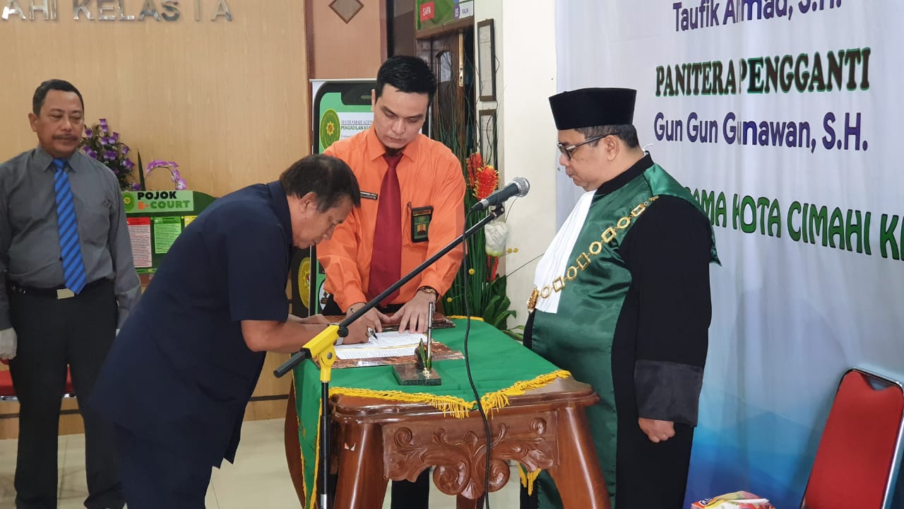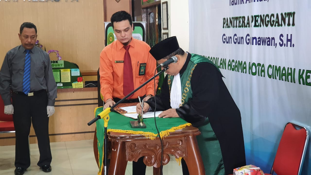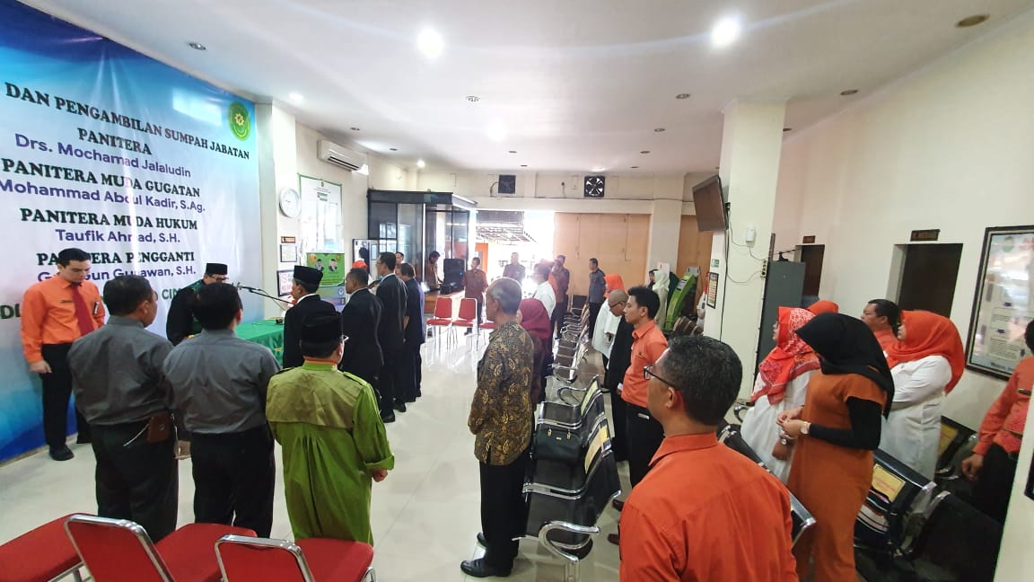 Cimahi, 20 Maret 2020 bertempat di Pengadilan Agama Kota Cimahi telah dilaksanakan acara Pelantikan dan Pengambilan Sumpah Jabatan Panitera Drs. Mochamad Jalaludin, Panitera Muda Gugatan Mohammad Abdul Kadir, S.Ag., Panitera Muda Hukum Taufik Ahmad, S.H., dan Panitera Pengganti Gun Gun Gunawan, S.H. Pengadilan Agama Kota Cimahi. Pada acara tersebut dihadiri oleh seluruh Pegawai Pengadilan Agama Kota Cimahi beserta tamu undangan. Dengan maraknya wabah virus Corona (COVID-19) di Negara Indonesia tercinta ini, sehingga rekan-rekan dari Pengadilan Agama lain tidak bisa menghadiri acara pelantikan dan pengambilan sumpah jabatan panitera, panitera muda gugatan, panitera muda hukum, dan panitera pengganti yang sedang dilantik. Alhamdulillah, acara dapat berjalan lancar dimulai dari pukul 09.00 WIB dan selesai pada pukul 11.30 WIB. Dalam acara pelantikan ini ada perkenalan dari Panitera, Panitera Muda Gugatan, Panitera Muda Hukum, dan Panitera Pengganti Pengadilan Agama Kota cimahi yang baru saja dilantik.