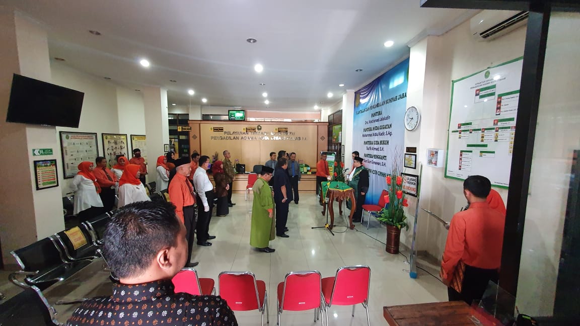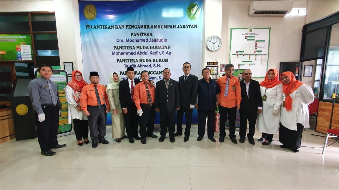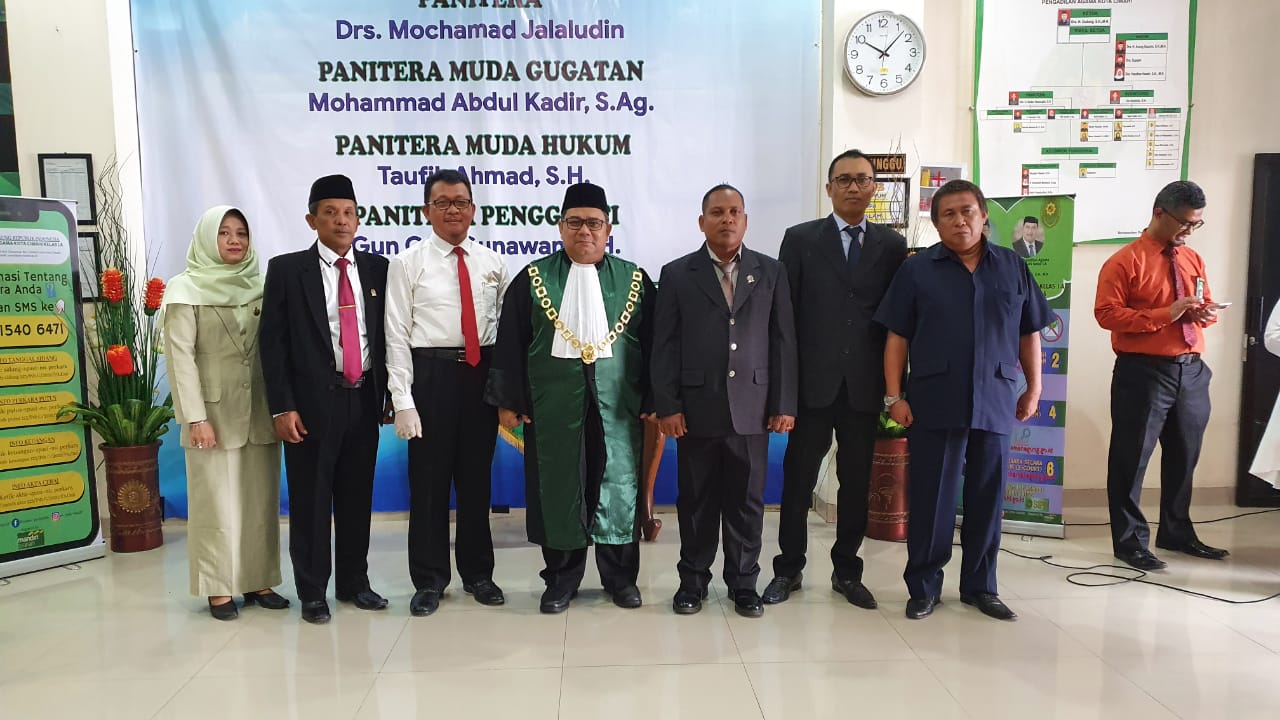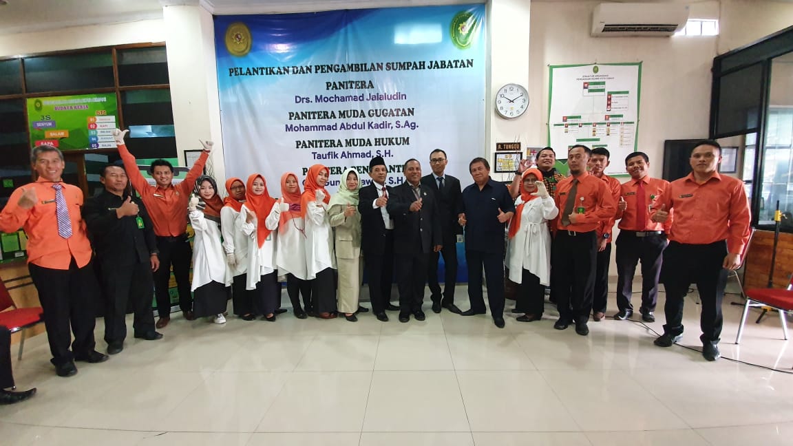 Cimahi, 20 Maret 2020 bertempat di Pengadilan Agama Kota Cimahi telah dilaksanakan acara Pelantikan dan Pengambilan Sumpah Jabatan Panitera Drs. Mochamad Jalaludin, Panitera Muda Gugatan Mohammad Abdul Kadir, S.Ag., Panitera Muda Hukum Taufik Ahmad, S.H., dan Panitera Pengganti Gun Gun Gunawan, S.H. Pengadilan Agama Kota Cimahi. Pada acara tersebut dihadiri oleh seluruh Pegawai Pengadilan Agama Kota Cimahi beserta tamu undangan. Dengan maraknya wabah virus Corona (COVID-19) di Negara Indonesia tercinta ini, sehingga rekan-rekan dari Pengadilan Agama lain tidak bisa menghadiri acara pelantikan dan pengambilan sumpah jabatan panitera, panitera muda gugatan, panitera muda hukum, dan panitera pengganti yang sedang dilantik. Alhamdulillah, acara dapat berjalan lancar dimulai dari pukul 09.00 WIB dan selesai pada pukul 11.30 WIB. Dalam acara pelantikan ini ada perkenalan dari Panitera, Panitera Muda Gugatan, Panitera Muda Hukum, dan Panitera Pengganti Pengadilan Agama Kota cimahi yang baru saja dilantik.