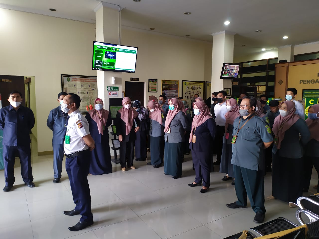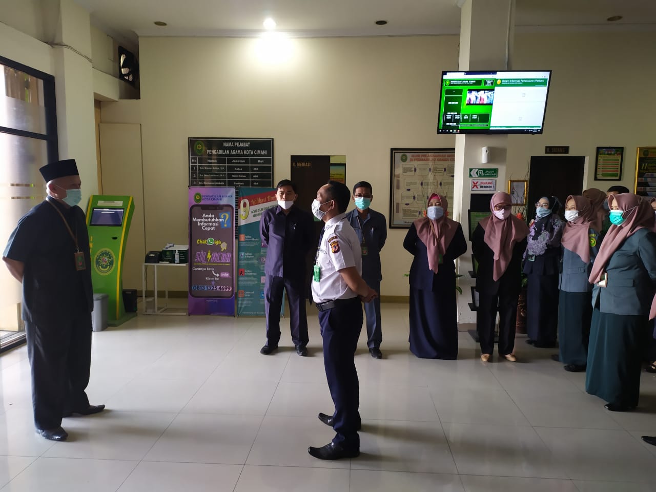 Hari Senin, 22 Februari 2021 pukul 07.45 bertempat di ruang tunggu pelayanan kantor Pengadilan Agama Kota Cimahi dilaksanakan kegiatan apel pagi rutin Pengadilan Agama Kota Cimahi. Bertindak sebagai pembina apel Hakim Pengadilan Agama Kota Cimahi, Bapak Drs. H. Anung Saputra, SH, MH dan pemimpin apel Bapak Ade Sutardi anggota satuan pengamanan Pengadilan Agama Kota Cimahi.