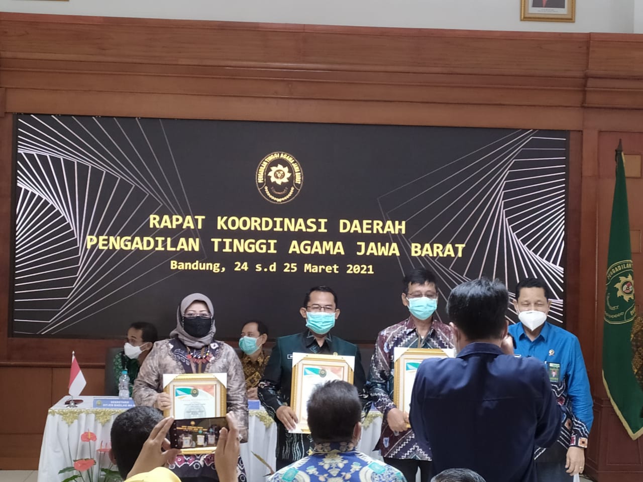 Cimahi - Pengadilan Agama Kota Cimahi menghadiri Rapat Koordinasi Daerah (RAKERDA) yang diselenggarakan oleh Pengadilan Tinggi Agama Jawa Barat selama dua hari, yaitu dari tanggal 24 - 25 Maret 2021. Acara RAKERDA ini dihadiri oleh seluruh satuan kerja di bawah Pengadilan Tinggi Agama Jawa Barat, dan adapun perwakilan dari Pengadilan Agama Kota Cimahi terdiri dari ketua, panitera, dan sekretaris. Sebelumnya, seluruh peserta yang mengikuti acara RAKERDA ini diwajibkan untuk melakukan swab-antigen. Pada acara di hari pertama, RAKERDA ini dibagi menjadi beberapa sesi, yaitu peresmian aplikasi, pemberian buku dan pemberian penghargaan.