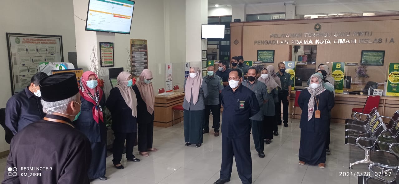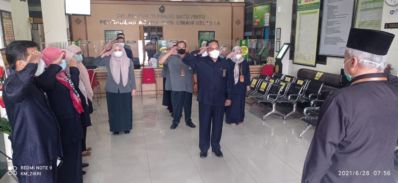 Hakim Pengadilan Agama Kota Cimahi, Drs. H. Anung Saputra, S.H., M.H., pimpin apel pagi pada hari senin tanggal 28 Juni 2021. Apel pagi tersebut dilaksanakan di ruang tunggu pelayanan Pengadilan Agama Kota Cimahi dan diikuti oleh para Hakim, Pejabat Struktural, Pejabat Fungsional, Pegawai dan Pegawai Pemerintah Non Pegawai Negeri (PPNPN) Pengadilan Agama Kota Cimahi.
